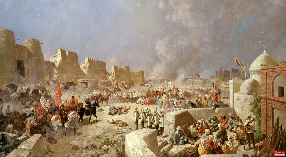 En mayo de 1868 las tropas rusas al mando del general Konstantín Kaufman conquistaron la ciudad. Ese mismo año, cuando las fuerzas rusas partieron en persecución del emir de Bujará, quedaba en la fortaleza de Samarcanda una guarnición rusa muy reducida: no más de setecientos hombres armados con fusiles, morteros y dos cañones. En la ciudad había 24 cañones de Bujará, pero estaban remachados e inutilizables.