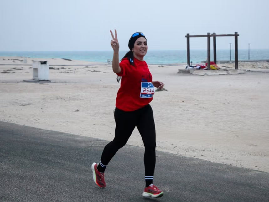 Una joven corre en un maratón en la isla iraní de Kish, en el golfo Pérsico, el 5 de diciembre de 2025. Foto: iranintl.com.
