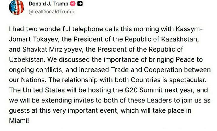 «Esta mañana mantuve dos conversaciones telefónicas maravillosas con Kasim-Yomart Tokáyev, presidente de la República de Kazajistán, y Shavkat Mirziyóyev, presidente de la República de Uzbekistán. Hablamos sobre la importancia de establecer la paz en los conflictos actuales, así como de ampliar el comercio y la cooperación entre nuestros países. Las relaciones con ambos países son magníficas. El próximo año, Estados Unidos acogerá la cumbre del G20 y enviaremos invitaciones a ambos líderes para que se unan a nosotros como invitados en este evento tan importante que tendrá lugar en Miami», señala la publicación de Trump.